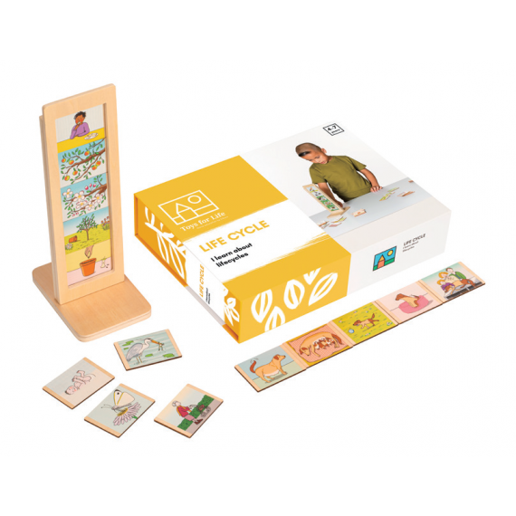 將生命週期以正確的順序放置在木架上。套裝包括:人、狗、黃蜂、蝴蝶、青蛙、鳥、花、胡蘿蔔、蘋果和米的生命週期。