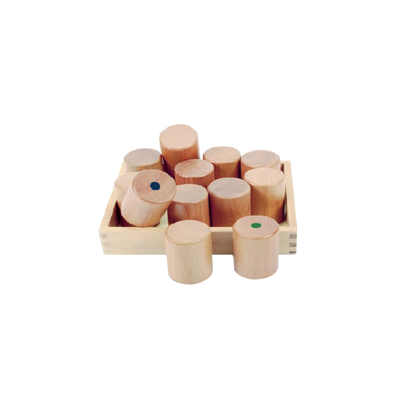 木板上有12個塑料圓筒,每一个小筒裡裝有重量不同的東西,透過手的感知來找出重量相同的兩個圓筒。幫助幼兒理解和感知輕重的概念。