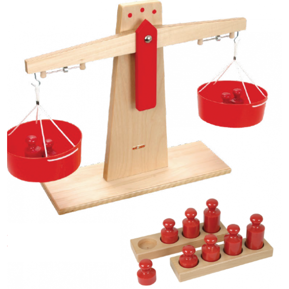一組非常穩固結實的木頭做的天平和塑料托盤。可在天平的兩端分别放進不同的物體,進行重量比較。共有8個塑料砝碼,高度依次從4到7 cm。學習等量和平衡的測量概念,理解數與量的對應關係。...