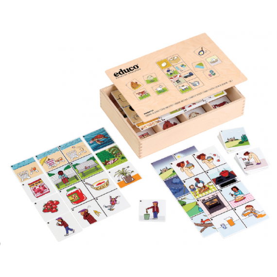 這款遊戲有8張不同主題的遊戲板,每一張遊戲板又有8張相關的小卡片,幼兒們要找到它們並且按照正確的順序排放。