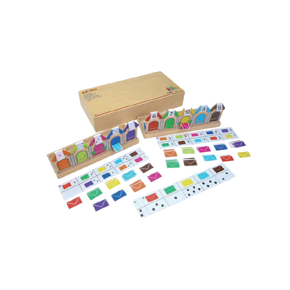 先讓一排房屋站立起來,然後根據顏色將信封投到正確的房子裡。也可以用任務卡來完成指定任務。提高色彩識別能力,培養計數能力,符號識別能力,以及邏輯思維能力。