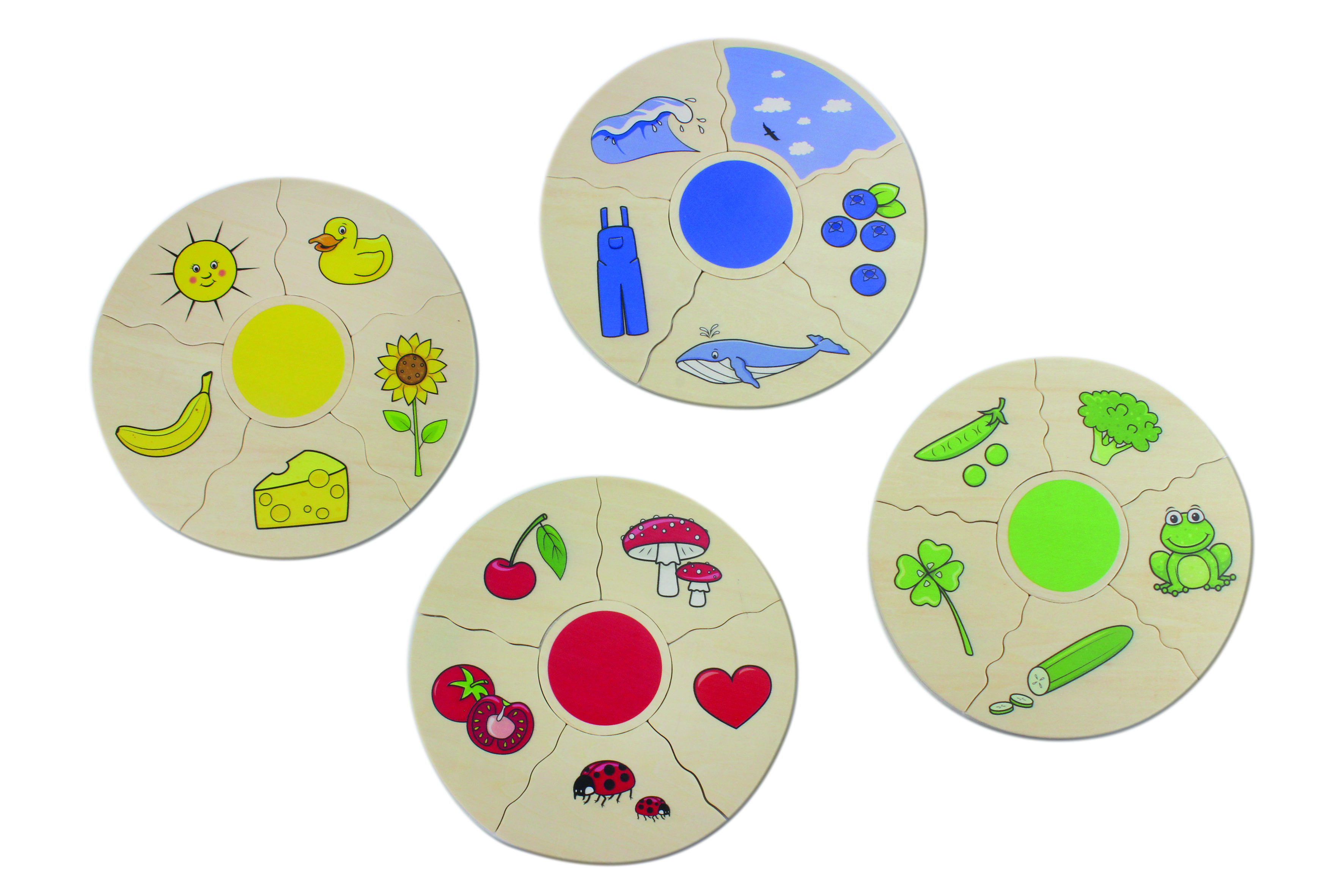 透過這款拼圖,孩子們可以認識並說出紅、藍、黃、綠這四種原色。拼圖的目標是將所有拼圖塊與正確的顏色相匹配。這款拼圖背面只印有物體的黑色輪廓,這增加了匹配的難度。