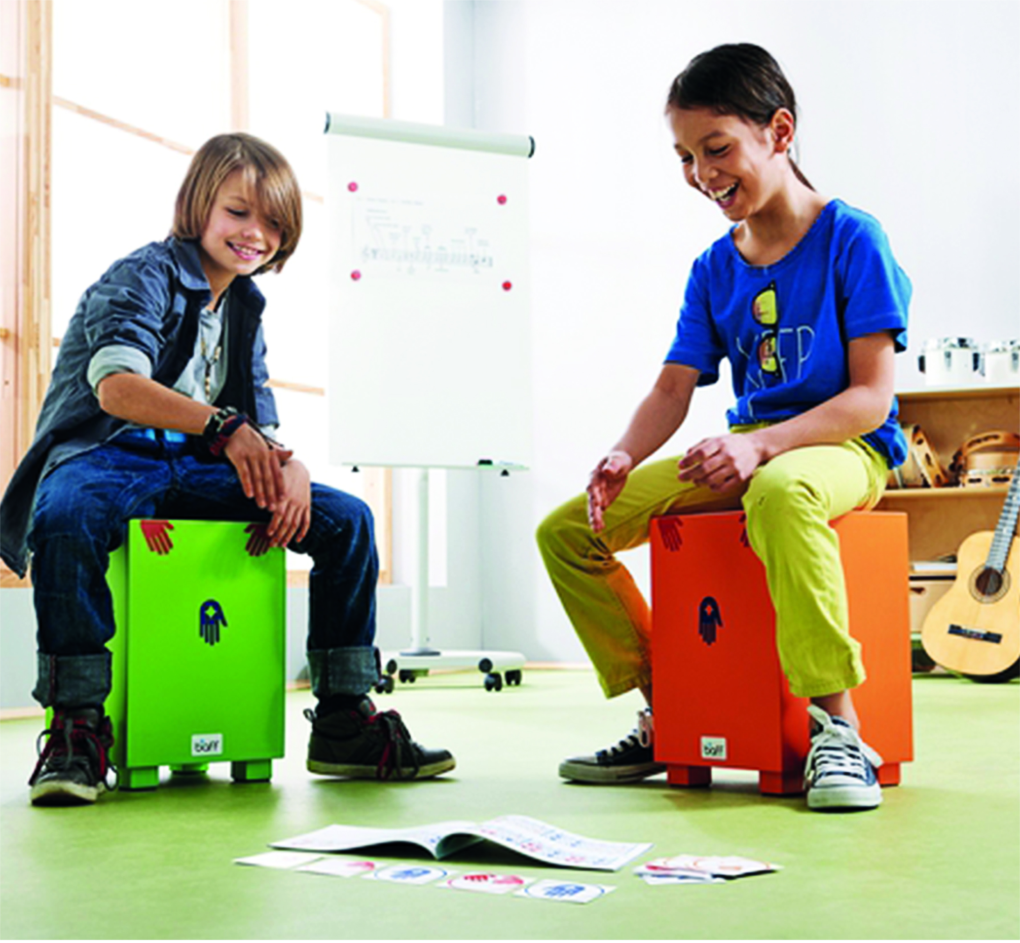 這些凳子功能齊全!坐上去就能立刻開始打鼓。音孔朝下,防止兒童伸手進去。卡洪鼓音色渾厚,低音和小鼓聲都十分飽滿。 30公分的座椅高度適合3-5歲的兒童。