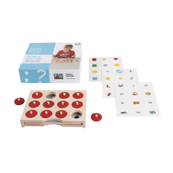 將一張分配卡插入遊戲盒上層架子,並嘗試透過提起紅色蓋子來找到相關對。發展手眼協產品尺寸:230 x 210 x 60h mm