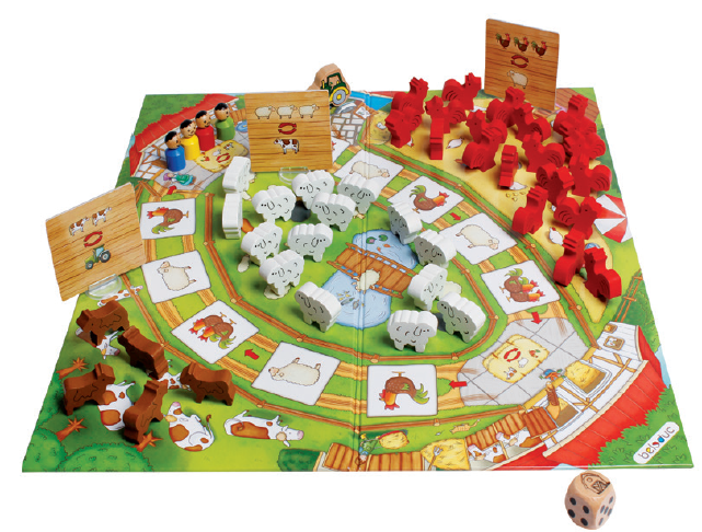 包裝尺寸:378 x 275 x 50h mm 內容物:1 個紙卡遊戲版 (367 x 367 x 2.4 mm),4 個遊戲玩偶,20 隻公雞,15 隻綿羊,5 隻乳牛,1 台拖曳車,3 個動物指標,3 個展示架,1 個骰子