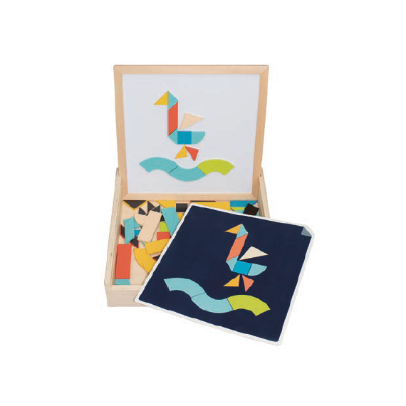 包裝尺寸:275 x 280 x 65h mm 人數: 1+ 內容物: 1 個帶開蓋的木箱(尺寸 350x350x67 mm)帶磁性表面的盒底和盒蓋,70 個不同形狀的磁性木製幾何圖形片,22 種不同任務的卡片